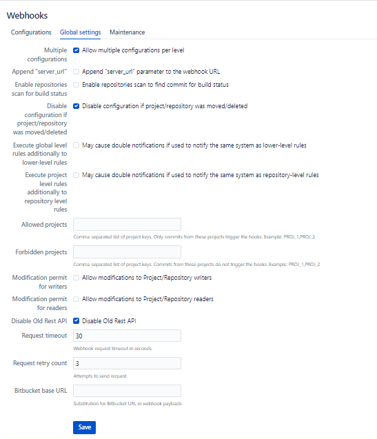 users can configure global, project, and repository webhooks: the app supports multiple configurations per level for project and repository configurations or only one configuration on a global level; this parameter can be changed;